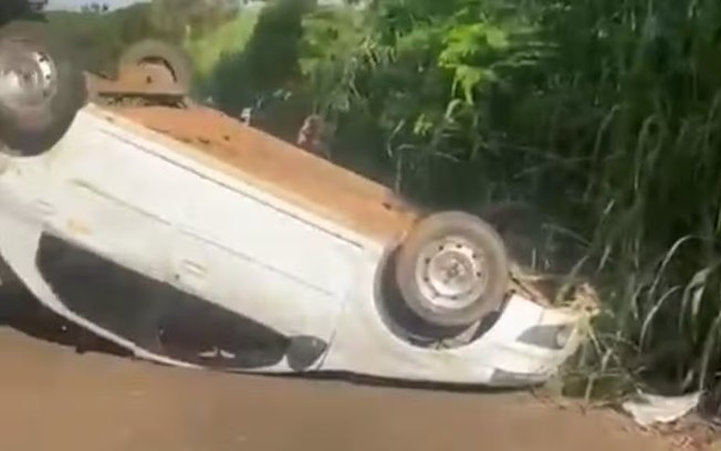 O carro ficou capotado em um estrada de terra após a perseguição da polícia. Com o acidente, objetos ficaram espalhados pelo local e os vidros do veículo ficaram destruídos.
