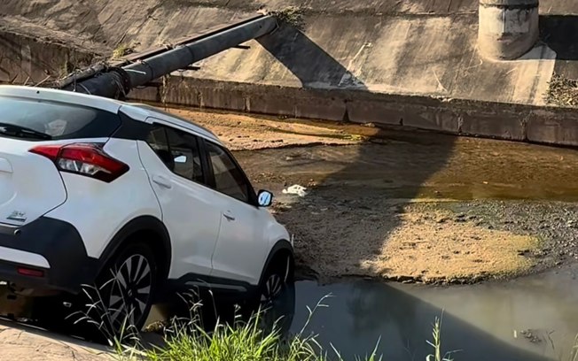 O acidente aconteceu próximo à faculdade Anhanguera, na altura do número 595, e o motorista e o carro, um Kicks branco, acabaram dentro do córrego.