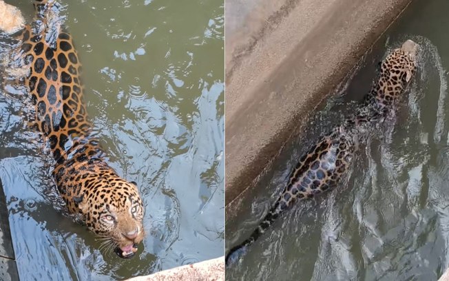 Uma onça-pintada caiu em um canal da usina hidrelétrica PCH Beleza, em Juscimeira, no estado de Mato Grosso, nesta quinta-feira (19), e não conseguia mais sair por causa da correnteza. Preso na estrutura, o animal ficou exposto e próximo de uma área por onde passam moradores.