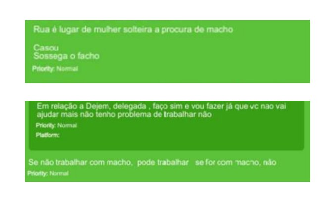 Mensagens do celular do tenente-coronel Geraldo Leite Rosa Neto revelam comportamento abusivo e possessivo com a soldado Gisele Alves Santana, antes dela ser morta. Em documentos obtidos pelo iG, o tenente chegou a afirmar: “Se não trabalhar com macho, pode trabalhar, se for com macho, não. Rua é lugar de mulher solteira à procura de macho. Casou. Sossega o facho”. Além disso, em outros pontos das conversas é possível ver que o tenente controlava as redes sociais de Gisele, e não permitia que ela trabalhasse com outros homens.