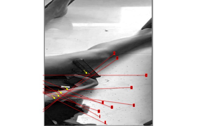 No momento em que Gisele, desfalece, para tentar suportar o peso da vítima, a pessoa colocou-a no chão e a arma foi colocada em sua mão direita.
