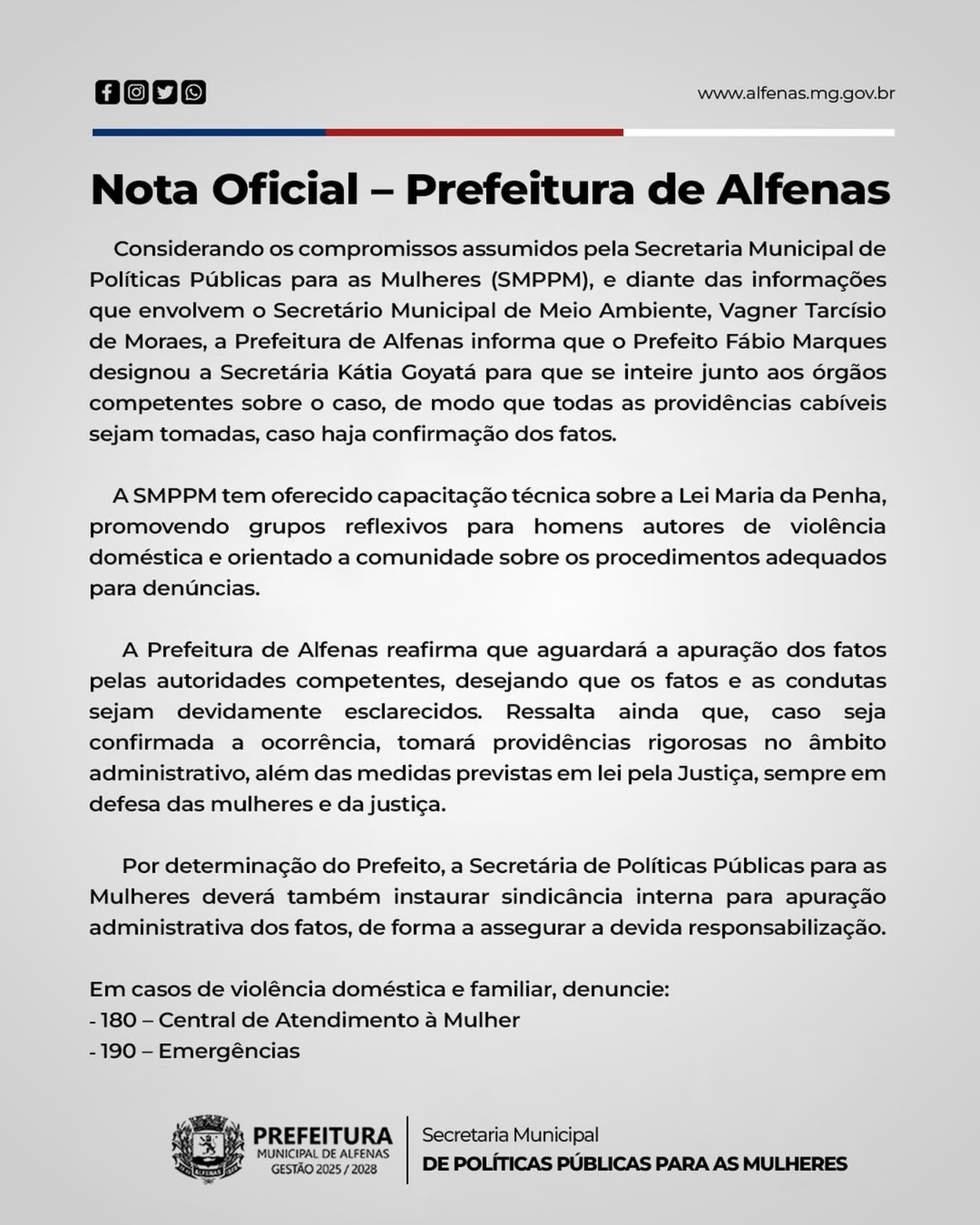 “Considerando os compromissos assumidos pela Secretaria Municipal de Políticas Públicas para as Mulheres (SMPPM), e diante das informações que envolvem o Secretário Municipal de Meio Ambiente, Vagner Tarcísio de Moraes, a Prefeitura de Alfenas informa que o Prefeito Fabio Marques designou a Secretária Kátia Goyatá para que se inteire junto aos órgãos competentes sobre o caso, de modo que todas as providências cabíveis sejam tomadas, caso haja confirmação dos fatos.