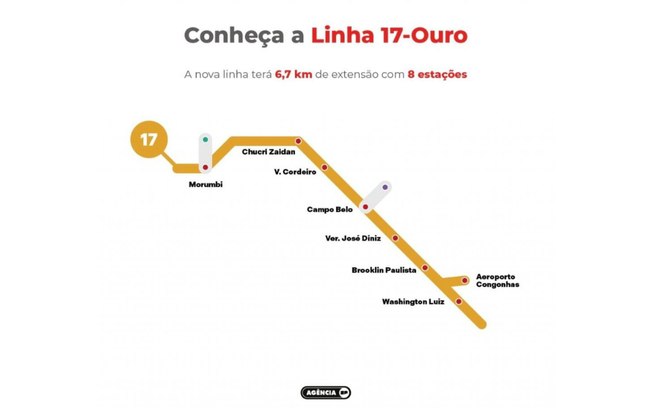 Ao todo, serão oito estações ao longo de 6,7 quilômetros, com conexão com as linhas 5-Lilás, na estação Campo Belo, e 9-Esmeralda, na estação Morumbi.