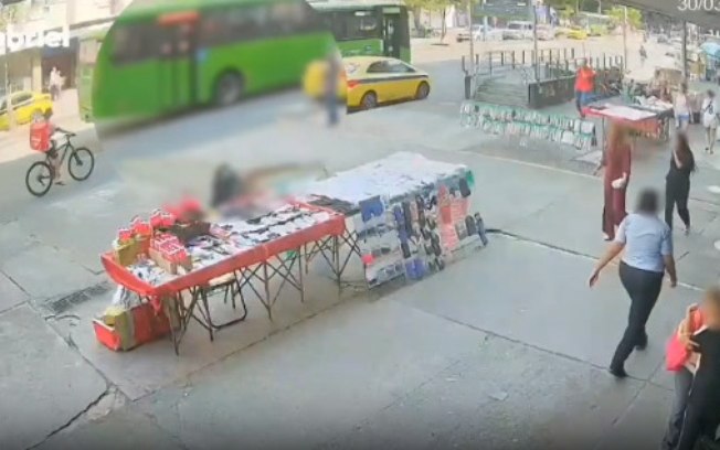 Poucos segundos depois, mãe e filho ressurgem no vídeo, já caídos no chão. Pedestres que testemunharam o acidente se aproximam para prestar socorro. O coletivo para alguns metros adiante.