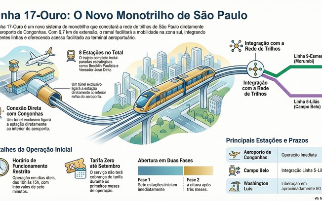 A Linha 17-Ouro do Metrô de São Paulo foi entregue nesta terça-feira (31) pelo governo estadual após 12 anos de atraso. A rede liga o Aeroporto de Congonhas a outras linhas, pelas linhas 9-Esmeralda e 5-Lilás, e vai funcionar de forma gratuita até setembro.