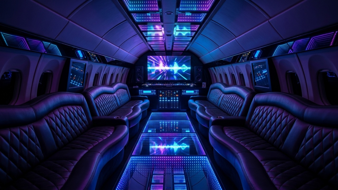 O interior da limusine parece mesmo uma discoteca voadora?