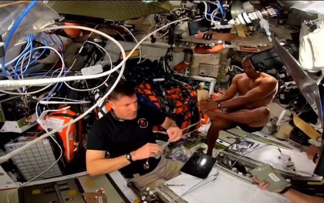 Quem assistia à transmissão, acompanhou um banho espacial, com toalha umedecida, do astronauta Victor Glover. Veja
