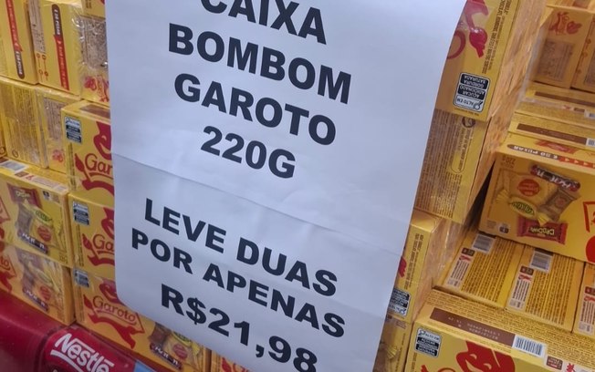Uma caixa de bombom Garoto custava R$ 21,49 na unidade, preço bem acima do praticado no mercado. O cartaz maior indicava duas por R$ 21,98. A diferença para levar o dobro era de poucos centavos.