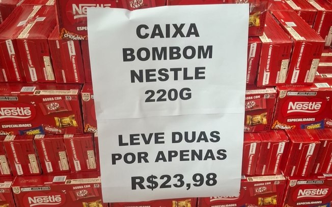 Outros produtos típicos de Páscoa na mesma loja seguiam lógica semelhante. Caixas de bombom Nestlé eram anunciadas por duas unidades a R$ 23,98. Os preços unitários, exibidos em placas menores no primeiro dia, ficavam próximos desse valor total.