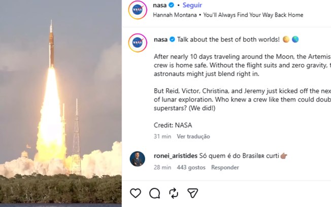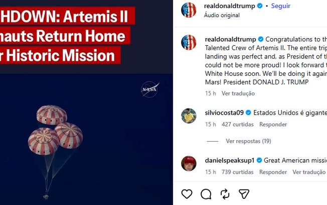 Em uma postagem no Instagram, o presidente dos Estados Unidos, Donald Trump, parabenizou a tripulação da Artemis II. A publicação dizia: