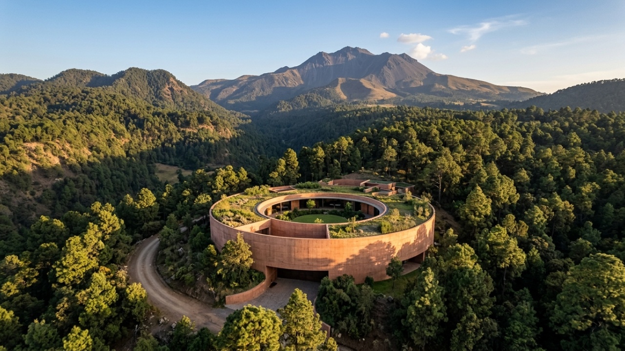 Num vale isolado nos arredores de Valle de Bravo, a três horas da Cidade do México, a arquiteta Fernanda Canales construiu uma casa circular que parece ter crescido diretamente da terra. O projeto chama-se Casa 720 Graus e foi concluído em 2024 com 1.115 m² distribuídos em aproximadamente 8.000 m² de terreno.