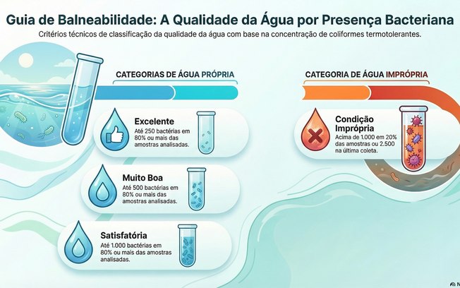 Para que a água seja considerada segura, ela deve manter baixos índices de contaminação em, pelo menos, 80% das análises realizadas. Enquanto a classificação imprópria é indicada quando os registros ultrapassam limites críticos de poluição ou apresentam picos elevados na testagem mais recente, ou seja, acima de 1.000 em mais de 20% das amostras ou valor superior a 2.500 conforme a última coleta.
