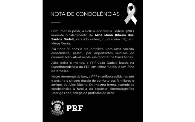 “Neste momento de luto, a PRF manifesta solidariedade e destina o sincero desejo de conforto aos familiares e amigos de Alice Ribeiro. Da mesma forma, estende às condolências a família do repórter cinematográfico Rodrigo Lapa, colega de profissão de Alice”, diz o comunicado.