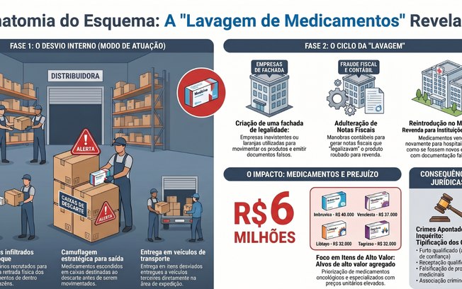 Após um ano de apuração, a investigação revelou um esquema sofisticado de “lavagem de medicamentos”. De acordo com a polícia, empresas de fachada eram utilizadas para reinserir no mercado produtos desviados de distribuidoras. Funcionários eram cooptados para retirar os remédios dos estoques e, por meio de fraudes fiscais e contábeis, os itens eram revendidos a instituições de saúde com notas adulteradas, simulando legalidade.